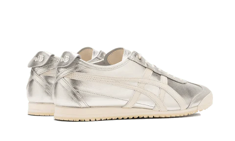 La Onitsuka Tiger Mexico 66 Silver présente une empeigne entièrement en cuir argenté, uniquement contrasté par un Tiger Stripes blanc cassé accordé aux lacets, aux brandings et à la fine semelle. Une petite languette, habillée d’un branding Tiger, apporte la dernière touche et aide à enfiler la paire au pied.