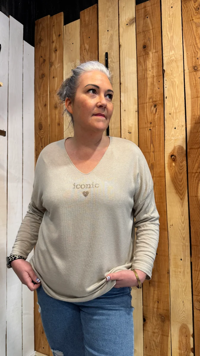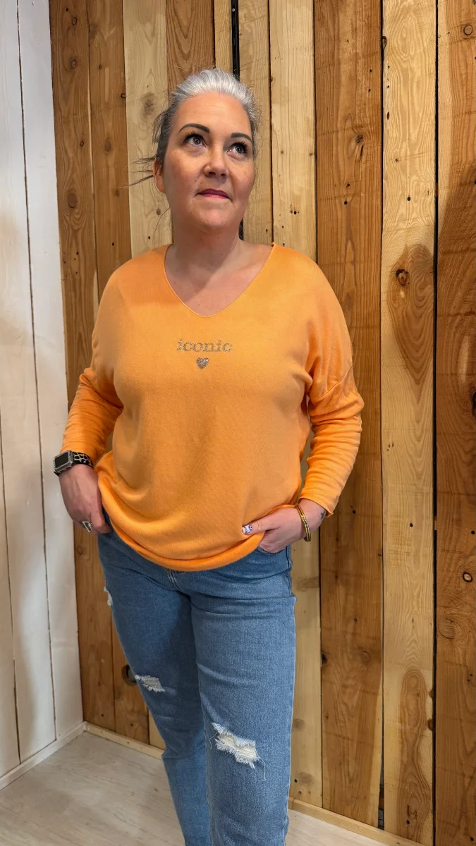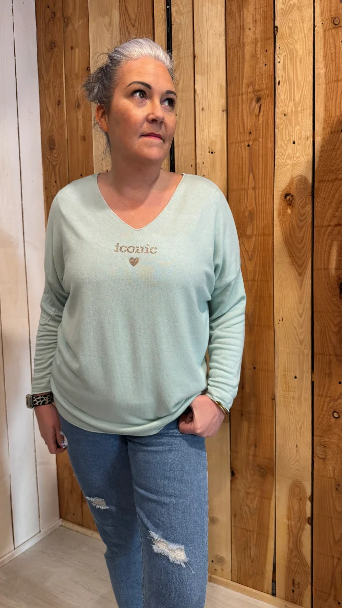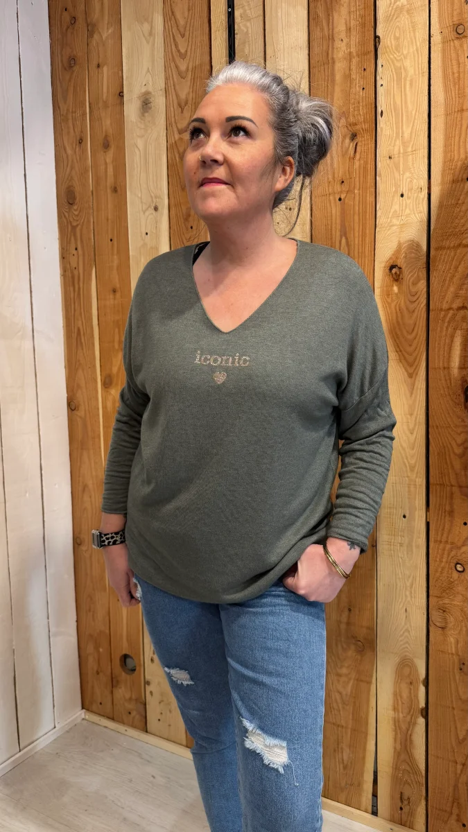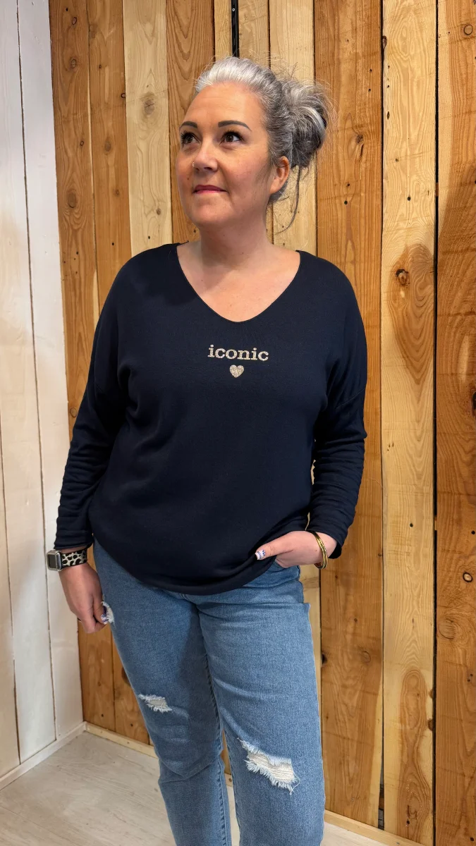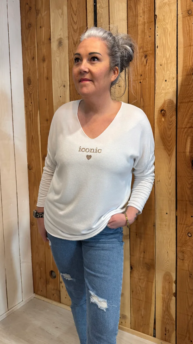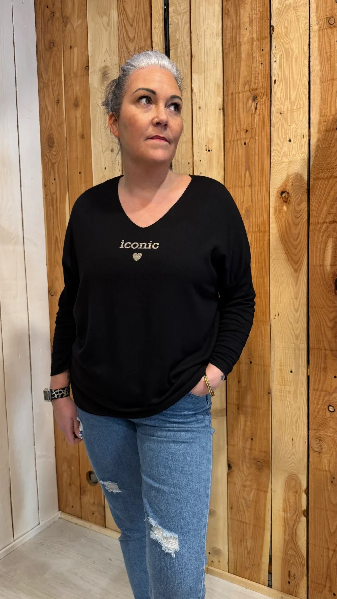 Avec sa matière ultra douce et fluide, il est aussi agréable à porter qu’à regarder. Son col en V met joliment le décolleté en valeur, tandis que l’inscription « iconic » apporte cette petite touche mode et girl power qu’on adore.